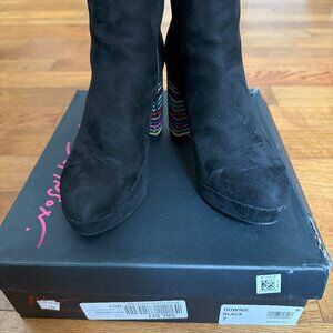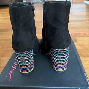Great condition! Comfortable black velvet booties with a colorful rhinestone heel