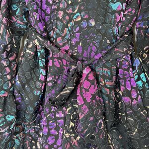 Color/Pattern: Black base with multicolor abstract animal print (purple, pink, teal tones)