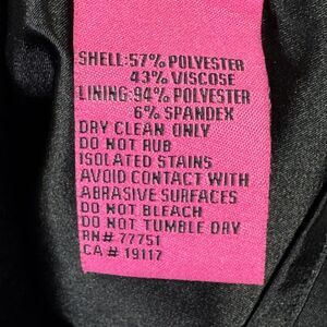 Care (per tag): Dry clean only; do not rub isolated stains; avoid contact with abrasive surfaces; do not bleach; do not tumble dry