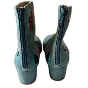 teal ankle boots, embroidered floral, canvas footwear, block heel, whimsical style, garden party, eclectic footwear, statement shoes, surreal aesthetics, textured design