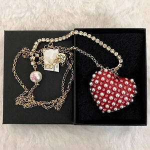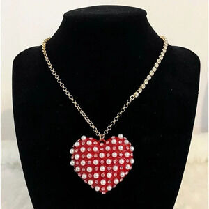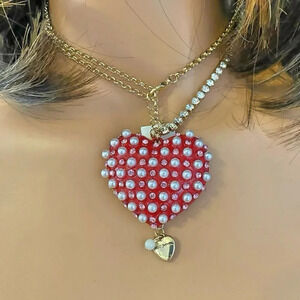 Betsey Johnson Faux Pearl & Pink Rhinestone Red Heart Necklace