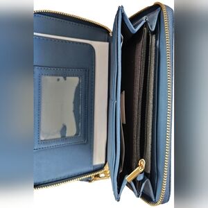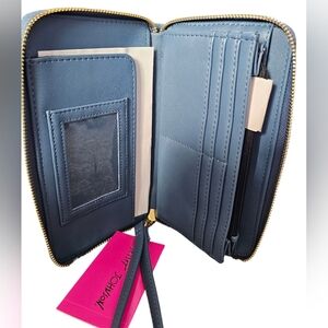 New with tags! Chic denim wristlet with colorful floral embroidery. Features a convenient wrist strap that is removable. 1 coin zipper pocket, 1 ID slot window, and 12 card slots. Color may vary due to camera lighting.