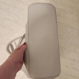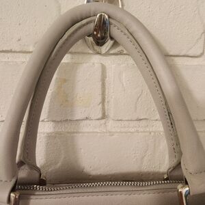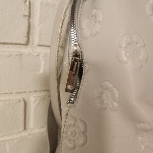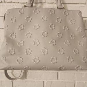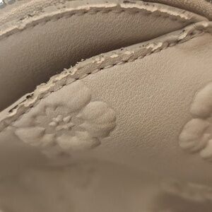 This elegant cream handbag features a beautiful floral embossed design, perfect for adding a touch of sophistication to any outfit. Ideal for daily use or special occasions. See pics for wear on the handles and straps. 11x15