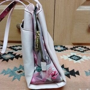 cute bow design on front, handles are light pink and multicolor floral like the sides of the bag, typical iconic Betsey Johnson signature floral interior, 3 compartments, front slip pocket