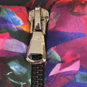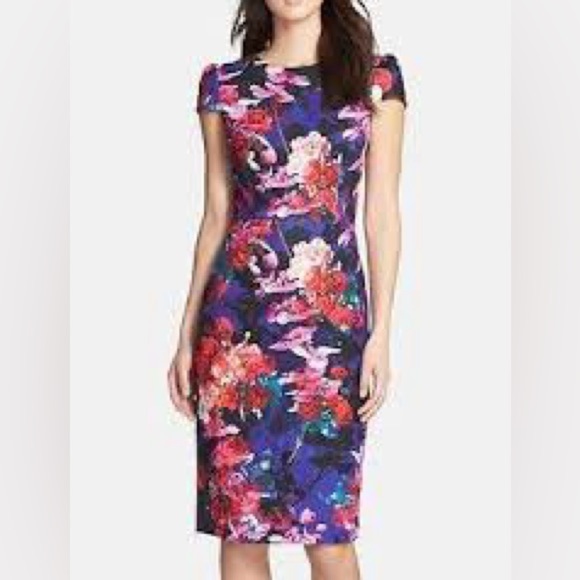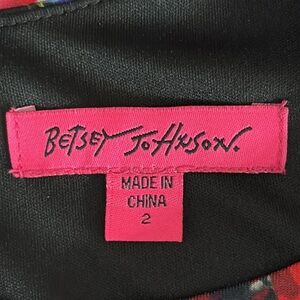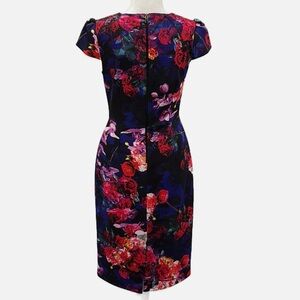 Betsey Johnson Floral Print Cap Sleeve Dress - Size 2. Excellent pre-owned condition. Round neckline, fully lined, sheath silhouette, exposed back zipper, kick split at back hem, cap sleeves, stretch, multi-colored floral print. Approximate measurements: 16" pit to pit, 13 1/2" waist, 39" length. Falls right below my knees and I'm 5'5".