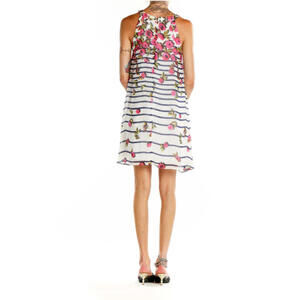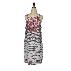 Add some flirty fun to your wardrobe with this beautiful Betsey Johnson halter tank mini dress. The floral and striped pattern in white, pink, and black is perfect for any occasion, from travel to weddings to casual outings. The dress features a zip closure and is made of lightweight, lined polyester that requires dry cleaning only. Ideal for spring and summer, this sleeveless dress with a short length and A-line silhouette is perfect for showing off your style. The dress is available in size 14 and is a regular fit. The dress's brand is Betsey Johnson, perfect for those looking for a unique and stylish look.