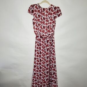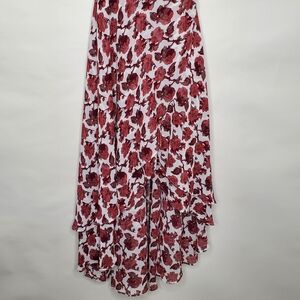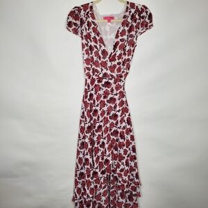 Betsey Johnson Rose Floral Wrap Dress Size 14 Midi Hi-Low. True wrap dress in burgundy and ivory with a layered asymmetric hem.
