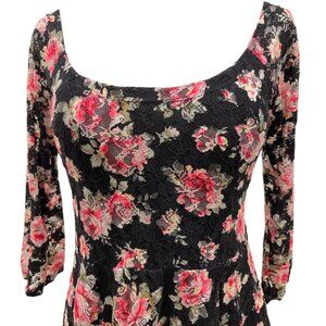 * Black Stretch Lace Dress with Red, Pink, and White Floral Pattern