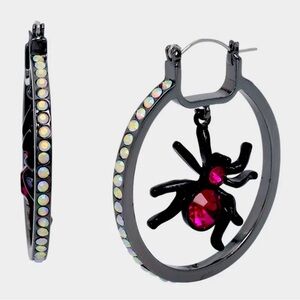 NWT Betsey Johnson Striking hoop earrings featuring minimal stones and dangling spider adorned with colorful pink stone gems. Earrings have glow in the dark components and click-top closure. Made from metal and glass.