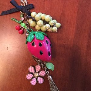 Adorable Betsey Johnson Long Garden Party Necklace. Has hanging charms- a big strawberry, a pink gingham flower, a bunch of grapes, cherries, and a green worm. Chain has ants crawling up the side. Love it!