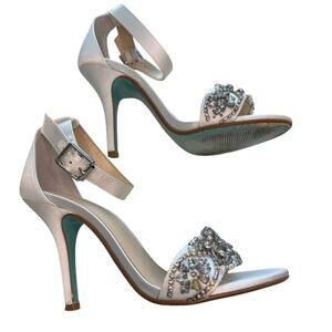 Add statement sparkle to your wardrobe with these Betsey Johnson Gina stiletto heels. Crafted in luxe white satin with intricate beaded detail, they feature a sleek ankle strap and slim stiletto heel for a glamorous finish. Perfect for weddings, formal events, or party‑ready styling, these heels balance elegance with standout design.