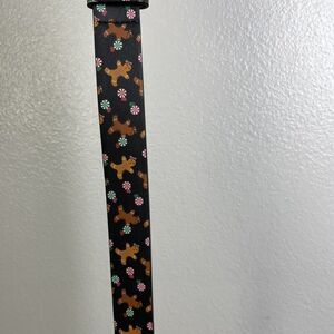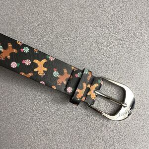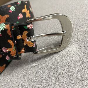 This listing is for a Betsey Johnson Women's Gingerbread Cookie Holiday Themed Belt. Black/Multicolor. Silver-toned buckle with an embossed logo. Approx 1.25in wide.