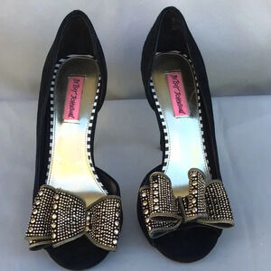 Betsey Johnson Glenda’s Black Suede Stiletto Heels With rhinestone & Bow Size 9
