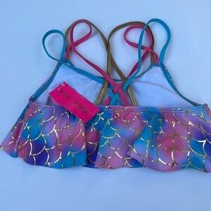 Here is a Betsey Johnson Gold Leme Mermaid Bikini Top Sequined Seashell GIRLS XL 14 UPF + 50 ultraviolet protection NWT