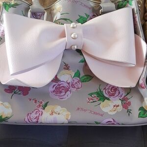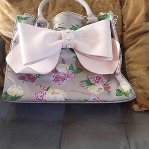 Betsey Johnson Gray Floral Satchel Cross Body Pink Bow Multiple Compartments EUC