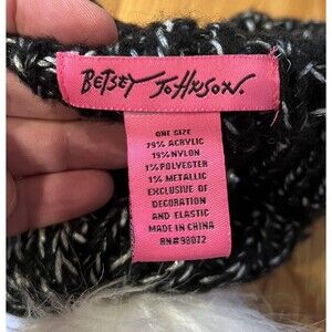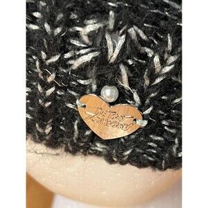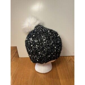 Betsey Johnson Hat Beanie Womens One Size Black Faux Fur Pom Pearl Metallic