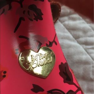Betsey Johnson Haylie Platform Sandal Heels, in suede coral pink, bow tie front, gold bow hardware, with iconic Betsey Johnson floral bottoms. Worn only a few times. 5.5" heel, 1.5" platform. Size 8.5.