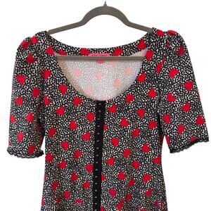 This vintage inspired 90s/y2k Betsey Johnson dress features a red heart and black and white leopard print pattern throughout. The babydoll-style dress has a fit-and-flare silhouette with hook-and-eye closures running down the center front. Black lace trim accents the short puff sleeves and hem. The dress has a scoop neckline and falls to a flared skirt.