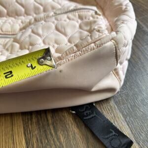 Adorable Betsey Johnson medium-sized backpack featuring a blush pink quilted exterior with heart stitching and a silver-tone metal logo plaque. The front zip pocket and spacious interior make it perfect for everyday use, travel, or school. Inside, you’ll find the signature floral “XO Betsey” printed lining along with a zip pocket and slip compartments for organization.