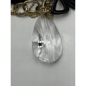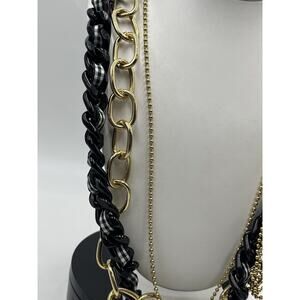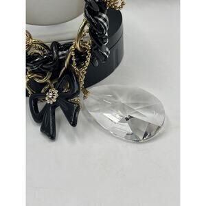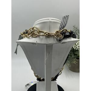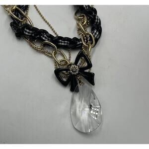 Betsey Johnson Heavy Multistrand Necklace Gold Tone Black White Ribbon Bow Charm