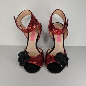 Betsey Johnson RED SEQUIN HIGH Heels 6 BLACK Flower VELVET TAKE ME HOME Stiletto