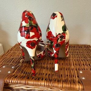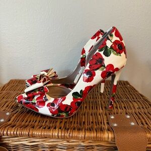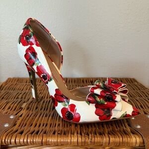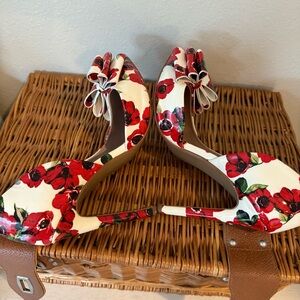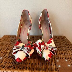 Betsey Johnson Heels White Red Floral Bow Women's Sz 7 Pinup Rockabilly Feminine