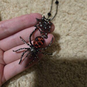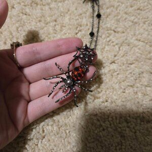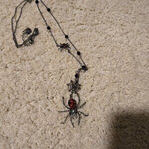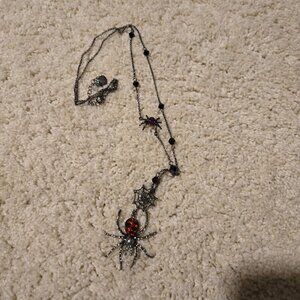 Betsey Johnson Hematite Tone Spider & Web Pendant Necklace With Crystal Accents - like new condition without the box. Gorgeous long pendant necklace, perfect for Halloween or a gothic look. Long pendant necklace in hematite dark tone silver and black beads with a spider web with crystal accents and a dangling red and black spider with a pearl and crystal accents. Little red and black spider halfway through the chain. Betsey logo on the hook as shown. Statement piece necklace.