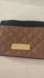 Elegant quilted design. Tan body with black accents. Gold-tone logo plate. Ideal for essentials.