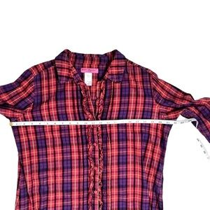 Betsey Johnson Intimates Vintage Y2K Pink Purple Plaid Long Sleeve Tunic Button Up Sleep Shirt Size Medium