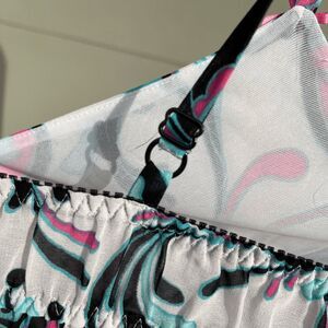 Vintage-inspired Betsey Johnson Intimates babydoll slip dress, showcasing her signature bold and playful style. The dress features a vibrant all-over abstract floral swirl print in pink, aqua, and black on a white background. Delicate pink satin bows and a central ribbon rosette accent the bust, adding a sweet, feminine touch. The adjustable spaghetti straps ensure a custom fit, while the smocked back provides comfort and flexibility. A ruffled hemline adds an extra layer of whimsy. Perfect for lounging or layering, this flirty piece embodies Betsey Johnson's iconic, irreverent fashion sense. Delicate pleating in front. Has elastic in back to help with fit as well as tie to help nip in the waist.