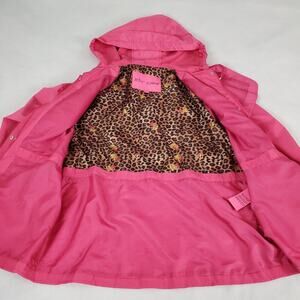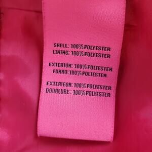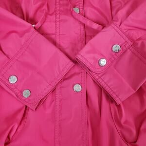 This Betsey Johnson jacket is designed for women in size large, featuring a feminine and stylish design perfect for the spring season. The jacket is made of nylon with a polyester lining, ensuring durability and comfort. The mid-length jacket in a pink color has a full zip closure with drawstring and snap accents, making it convenient for travel or casual wear. The hooded jacket also includes zipper accents, adding a trendy touch to the overall Barbie-inspired theme.