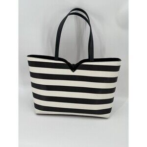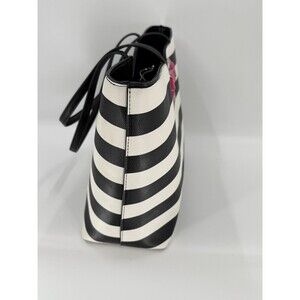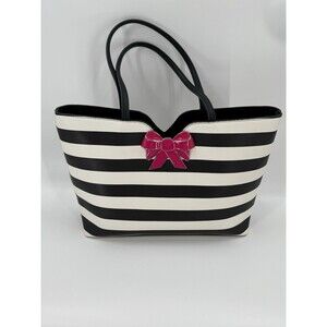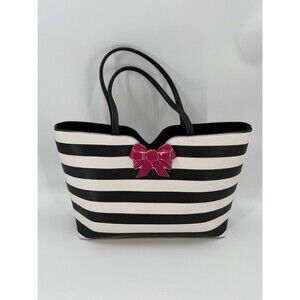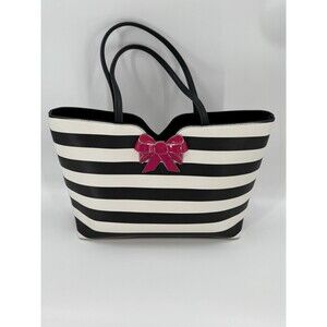 Betsey Johnson KITSCH Black White Striped Pink Bow Large Tote Shoulder Bag EUC