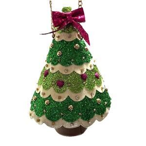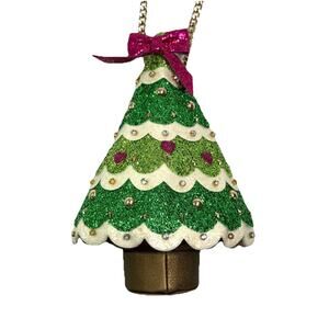 The Betsey Johnson Kitsch Christmas Tree Crossbody Purse Handbag is a festive and glamorous accessory perfect for the holiday season. This small green handbag features a glittery Christmas tree design on the exterior, with rhinestone and bow accents for added sparkle. The crossbody style is convenient for carrying on the go, while the gold hardware and handle add a touch of luxury. This rare and whimsical purse is ideal for parties or cocktail events, making a statement with its playful and eye-catching design.