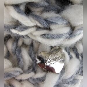 Betsey Johnson Openwork Knit Tube Scarf in a grey and white blend, made of 100% acrylic. This cowl-style scarf is one-size-fits-all. Features pearl beads and heart shape designer tag.
