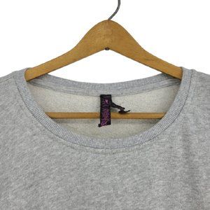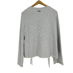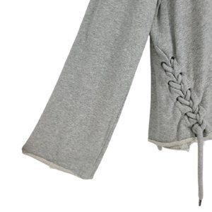 Betsey Johnson gray, oversize, semi-crop fleece with wide sleeve and lace up sides. Boxy fit. Raw edges and hems. Size large. Gently used condition. Approximate flat lay measurements: armpit to armpit 20", length 20", sleeve 25".