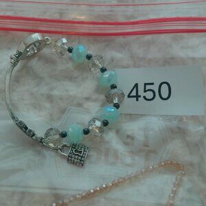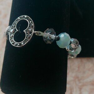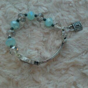 The Betsey Johnson Lady Lock LARGE Hematite Crystal Grey Key Opal Lock Bracelet is a stylish and unique piece of jewelry. Made from a combination of metal, glass, crystal, and elastic, this bracelet features a stretch design and a beautiful blue color. The main stone is a large crystal, with the secondary stone being hematite. The beaded style and key theme add a fun and fashionable touch to this accessory, perfect for adding a pop of color and glamour to any outfit.