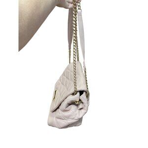 This Betsey Johnson handbag offers a blend of style and functionality for modern women. The quilted design adds a sophisticated touch, while the gold chain strap provides an elegant complement. Its spacious interior makes it suitable for daily use, accommodating essentials comfortably. It is in very good condition in and out. No defects noted. SKU 9230