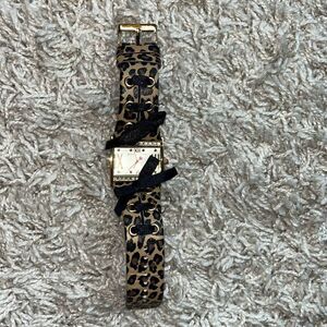 Betsey Johnson Large Square Faced Gold Tone Women’s Quartz Watch Cheetah Print Band EUC