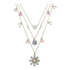 Bring a playful, feminine charm to any outfit with this stunning Betsey Johnson multi-layer daisy statement necklace set. Featuring three delicate, layered gold-tone chains, each strand showcases its own whimsical detail — from shimmering crystal daisy pendants to faux pearls and sparkling bead accents. The top layer highlights a petite white enamel daisy with a faux pearl center, the middle chain features a blue crystal daisy charm accented by small pearl drops, and the bottom chain steals the show with a large pavé crystal daisy pendant that glitters with every move.