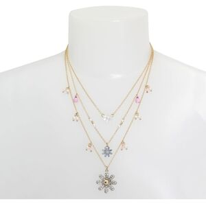 Bring a playful, feminine charm to any outfit with this stunning Betsey Johnson multi-layer daisy statement necklace set. Featuring three delicate, layered gold-tone chains, each strand showcases its own whimsical detail — from shimmering crystal daisy pendants to faux pearls and sparkling bead accents. The top layer highlights a petite white enamel daisy with a faux pearl center, the middle chain features a blue crystal daisy charm accented by small pearl drops, and the bottom chain steals the show with a large pavé crystal daisy pendant that glitters with every move.
