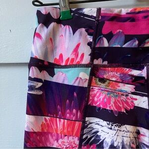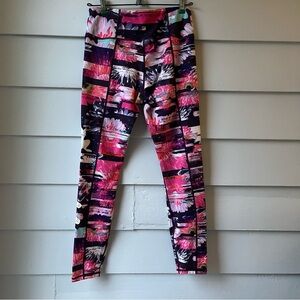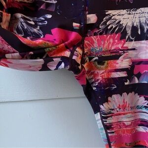 These Betsey Johnson leggings showcase a vibrant blend of pink and purple hues in an artistic design. Crafted from a stretchy material, they offer a form-fitting silhouette perfect for yoga or athletic activities. The dynamic pattern adds a modern and energetic touch to your activewear collection.