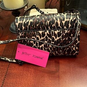 NWT Stylish Betsey Johnson leopard print crossbody bag perfect for any occasion. Features a chic design with a convenient chain and material strap for easy carrying.