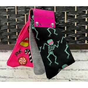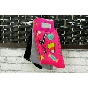 ITEM: Betsey Johnson Logo 3 Pk Pink-Gray-Black Halloween Theme Print Crew Socks