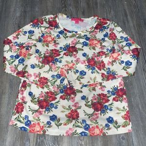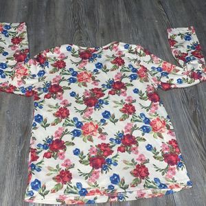Fresh in for spring! This top is actually a girls' size large (12) so it fits like a women's XS or S. Gorgeous Betsey Johnson floral pattern featuring roses, rosebuds, blue cornflowers, and another small pink flower. Rich pigment and detailed print, but easy care instructions (just wash inside out to maximize color vibrancy).