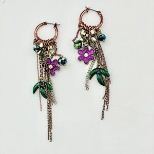 The earrings are redux of the 2011 Collection Asian Jungle, specifically the purple glitter flowers and green leaves. Pierced hoop earrings made of different lengths of chains, with iridescent beads and enamel flowers and leaves on gold tone metals. About 4” long. Rare and hard to find.