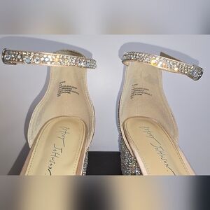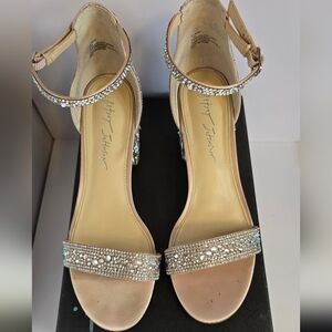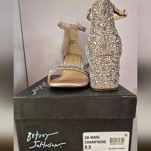 Betsey Johnson MARI champagne heels, size 8.5. Worn once for approximately 6 hours at a wedding. Excellent condition with no missing crystals. Slight signs of wear on the inner shoe, and painted bottoms show expected wear from light use. Stunning and sparkly, perfect for formal events or parties!