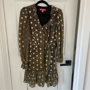 Betsey Johnson Metallic Black Gold Star Faux Wrap Dress Ruffles