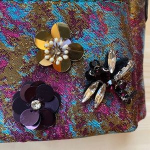 Small outer pocket embellished with rhinestone and sequin flowers and dragonfly.