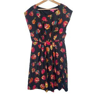 Betsey Johnson Mini Dress Black Floral Rose Print Short Sleeve Pleated Size 12