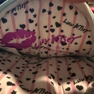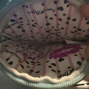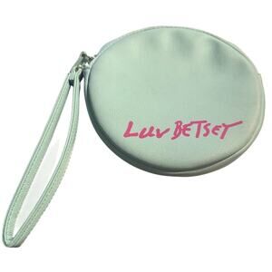 Betsey Johnson Mint Ice Blue Sleepy Bear Cat Eye Glasses Wristlet Purse. Cartoon bear face with silver cat eye glasses, closed eyes with lashes, heart shaped nose, and pink lips. Luv Betsey written in pink script. Signature Luv Betsey lining with pink stripes, black hearts/stars, and lipstick kiss graphic. 6" x 6". Excellent condition.